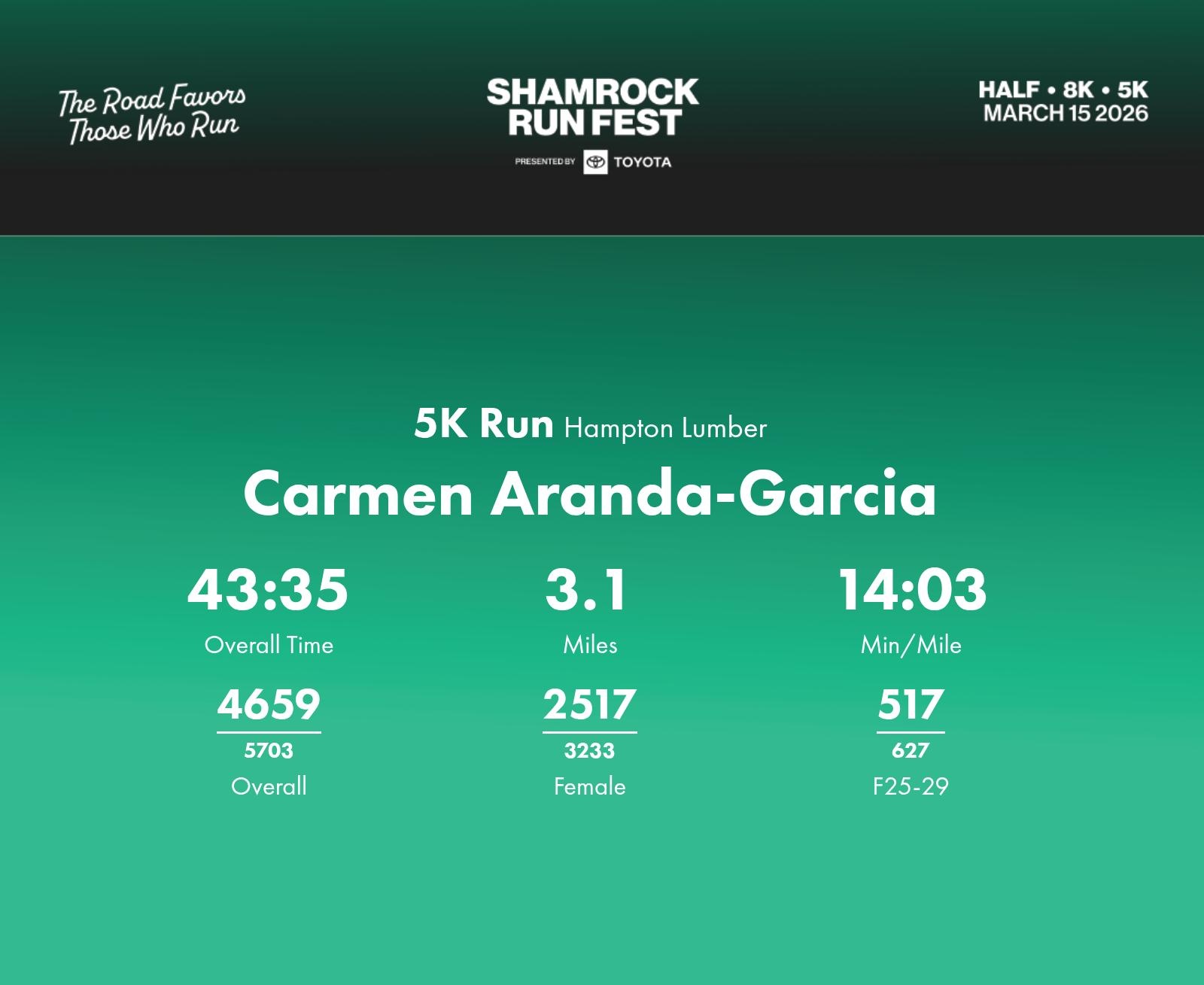 Date: March 15, 2026 Participant: Carmen Aranda-Garcia #40285 Race: 2026 Shamrock Run Fest presented by Toyota 5K Run Distance: 3.1 miles