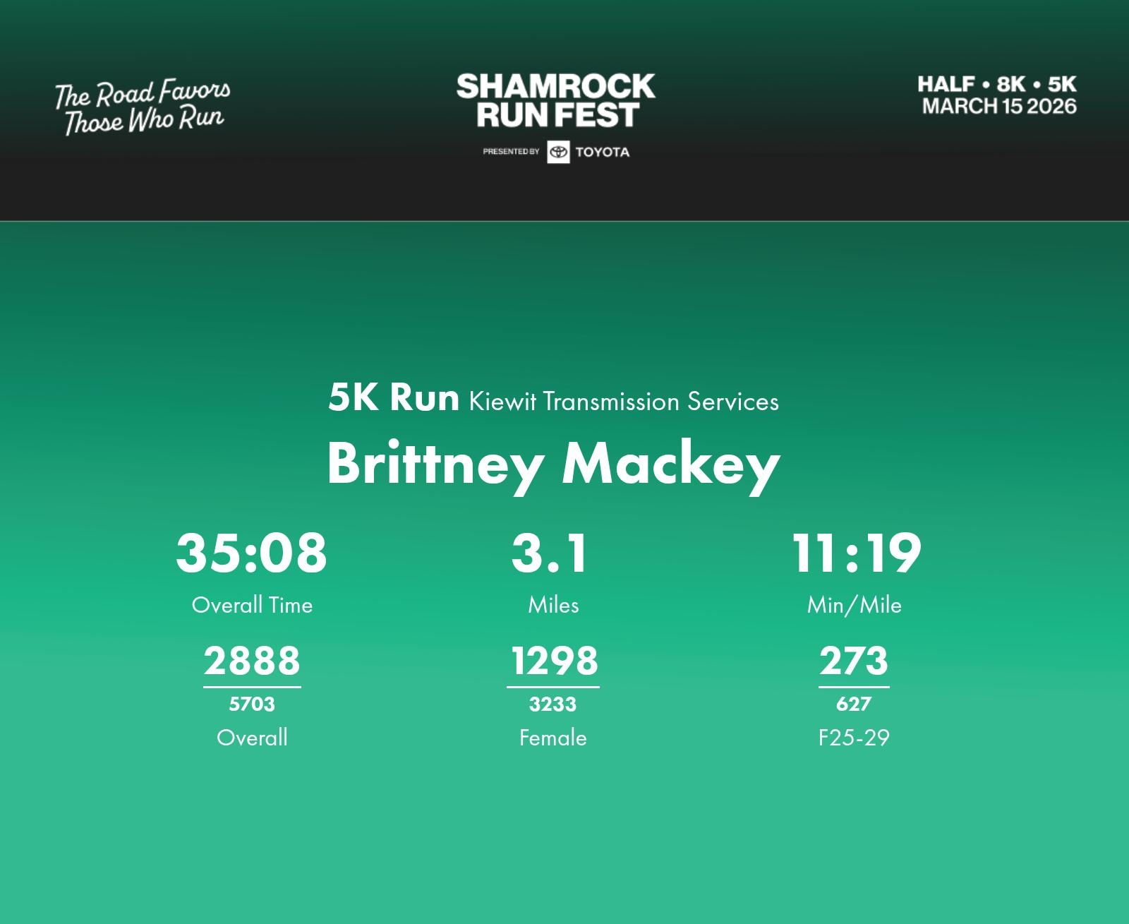 Date: March 15, 2026 Participant: Brittney Mackey #43316 Race: 2026 Shamrock Run Fest presented by Toyota 5K Run Distance: 3.1 miles