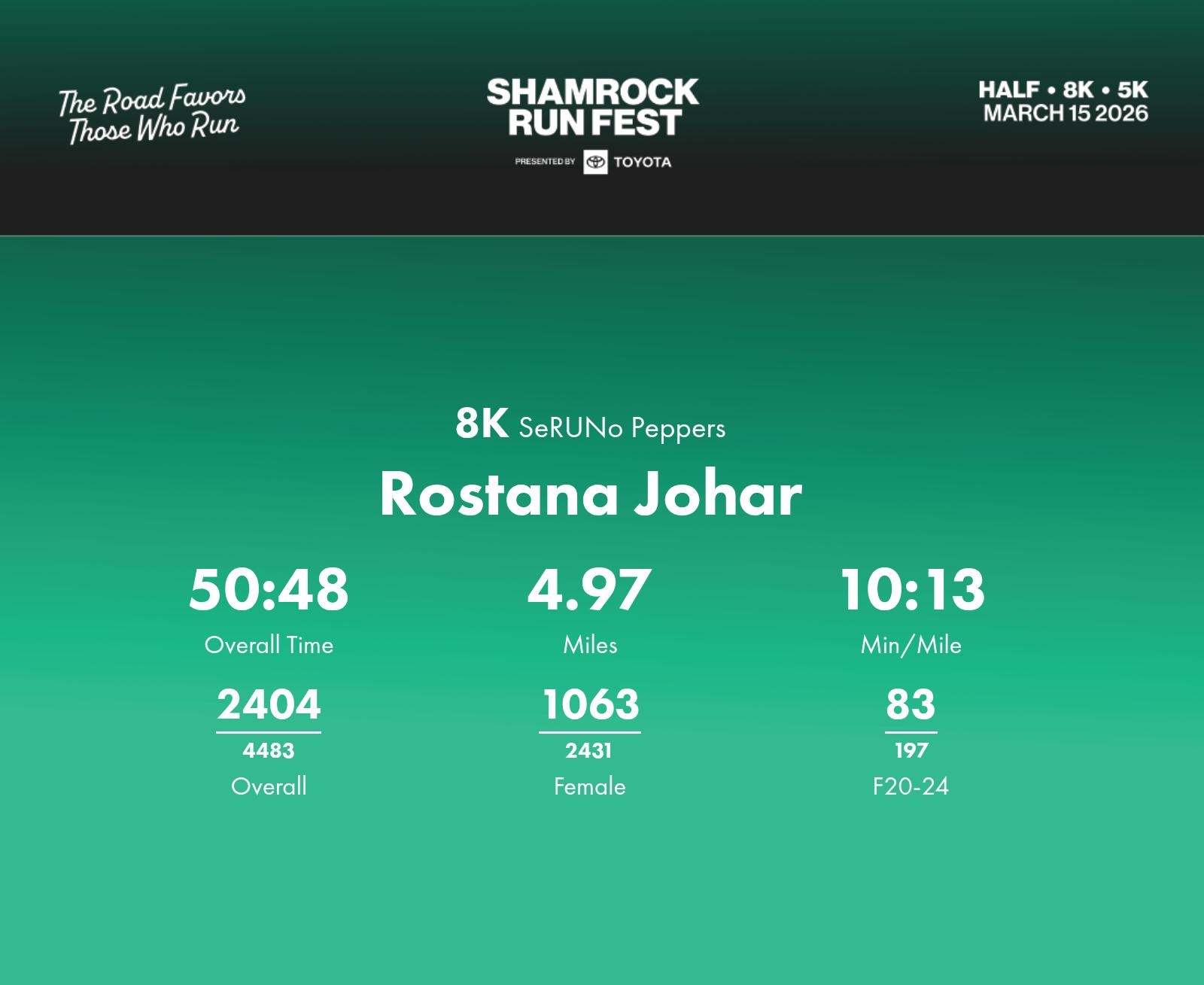 Date: March 15, 2026 Participant: Rostana Johar #30615 Race: 2026 Shamrock Run Fest presented by Toyota 8K Distance: 5.0 miles