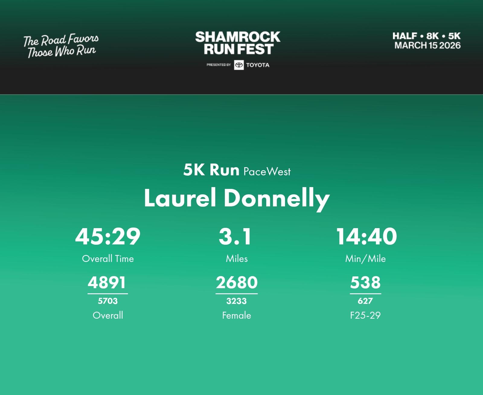 Date: March 15, 2026 Participant: Laurel Donnelly #44244 Race: 2026 Shamrock Run Fest presented by Toyota 5K Run Distance: 3.1 miles