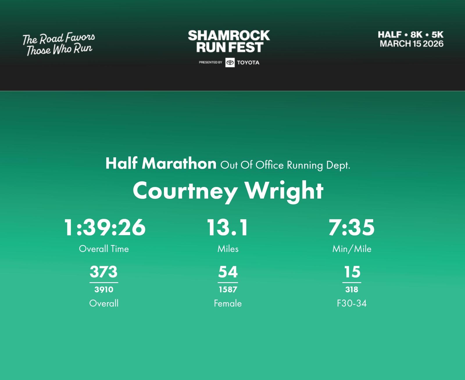 Date: March 15, 2026 Participant: Courtney Wright #1300 Race: 2026 Shamrock Run Fest presented by Toyota Half Marathon Distance: 13.1 miles