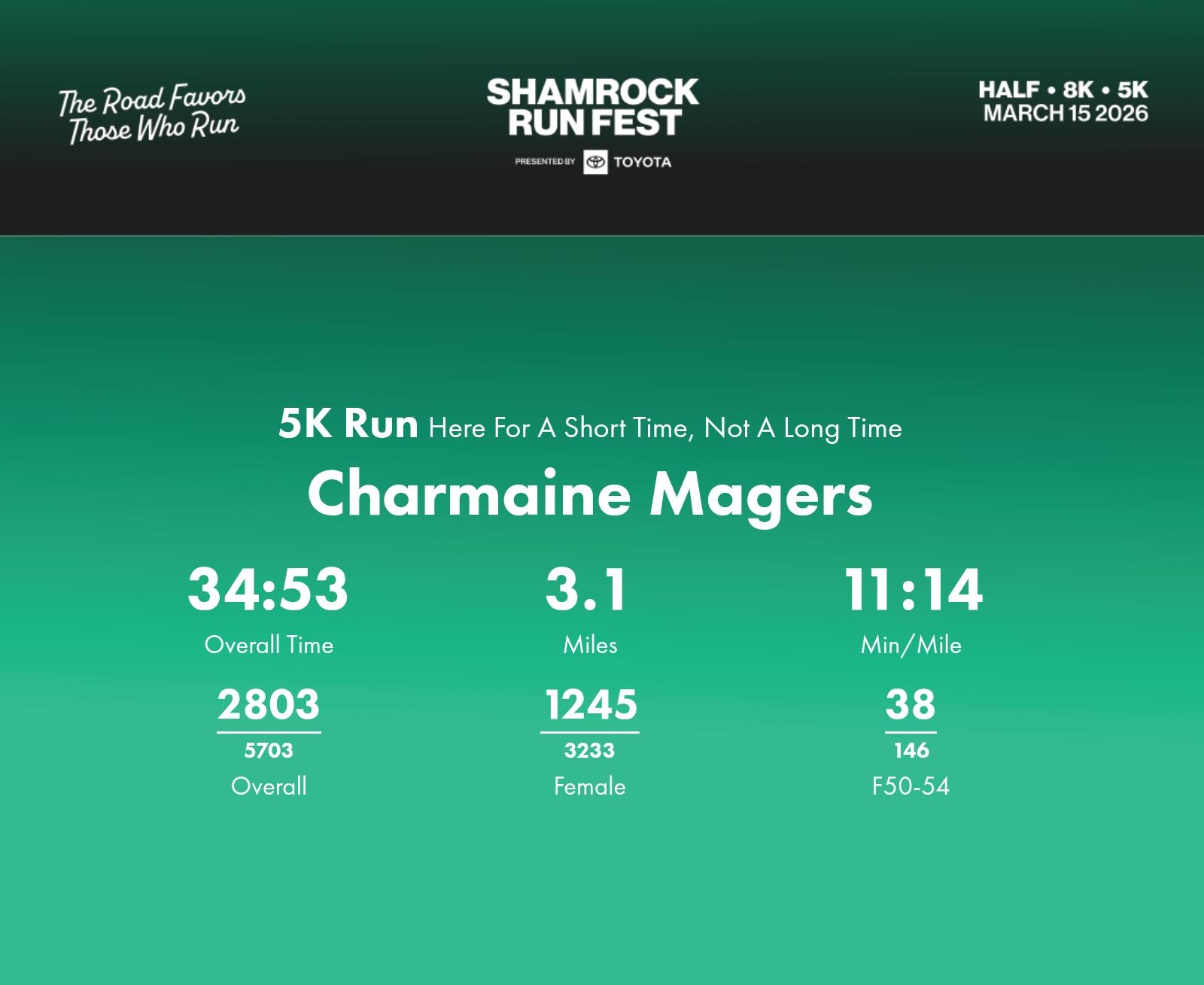 Date: March 15, 2026 Participant: Charmaine Magers #41481 Race: 2026 Shamrock Run Fest presented by Toyota 5K Run Distance: 3.1 miles