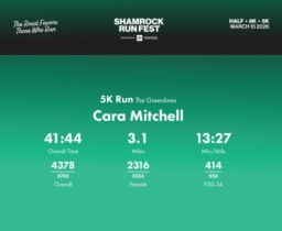 Date: March 15, 2026 Participant: Cara Mitchell #44108 Race: 2026 Shamrock Run Fest presented by Toyota 5K Run Distance: 3.1 miles