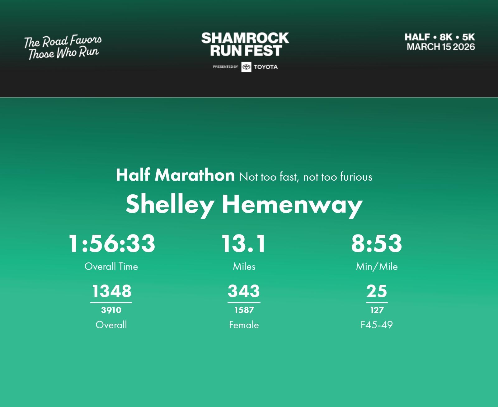 Date: March 15, 2026 Participant: Shelley Hemenway #1257 Race: 2026 Shamrock Run Fest presented by Toyota Half Marathon Distance: 13.1 miles