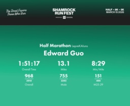 Date: March 15, 2026 Participant: Edward Guo #1230 Race: 2026 Shamrock Run Fest presented by Toyota Half Marathon Distance: 13.1 miles