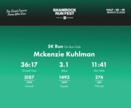 Date: March 15, 2026 Participant: Mckenzie Kuhlman #44889 Race: 2026 Shamrock Run Fest presented by Toyota 5K Run Distance: 3.1 miles