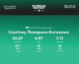 Date: March 15, 2026 Participant: Courtney Thompson-Kurosawa #34220 Race: 2026 Shamrock Run Fest presented by Toyota 8K Distance: 5.0 miles