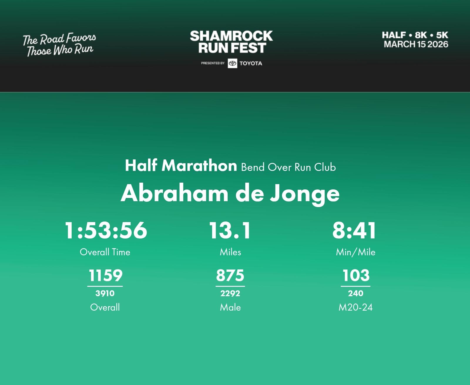 Date: March 15, 2026 Participant: Abraham de Jonge #1715 Race: 2026 Shamrock Run Fest presented by Toyota Half Marathon Distance: 13.1 miles