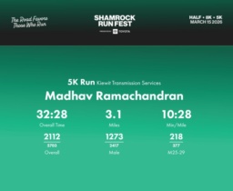 Date: March 15, 2026 Participant: Madhav Ramachandran #43319 Race: 2026 Shamrock Run Fest presented by Toyota 5K Run Distance: 3.1 miles