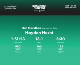 Date: March 15, 2026 Participant: Hayden Hecht #5319 Race: 2026 Shamrock Run Fest presented by Toyota Half Marathon Distance: 13.1 miles