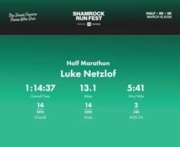 Date: March 15, 2026 Participant: Luke Netzlof #2689 Race: 2026 Shamrock Run Fest presented by Toyota Half Marathon Distance: 13.1 miles