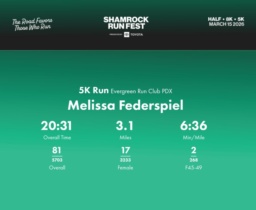 Date: March 15, 2026 Participant: Melissa Federspiel #42651 Race: 2026 Shamrock Run Fest presented by Toyota 5K Run Distance: 3.1 miles