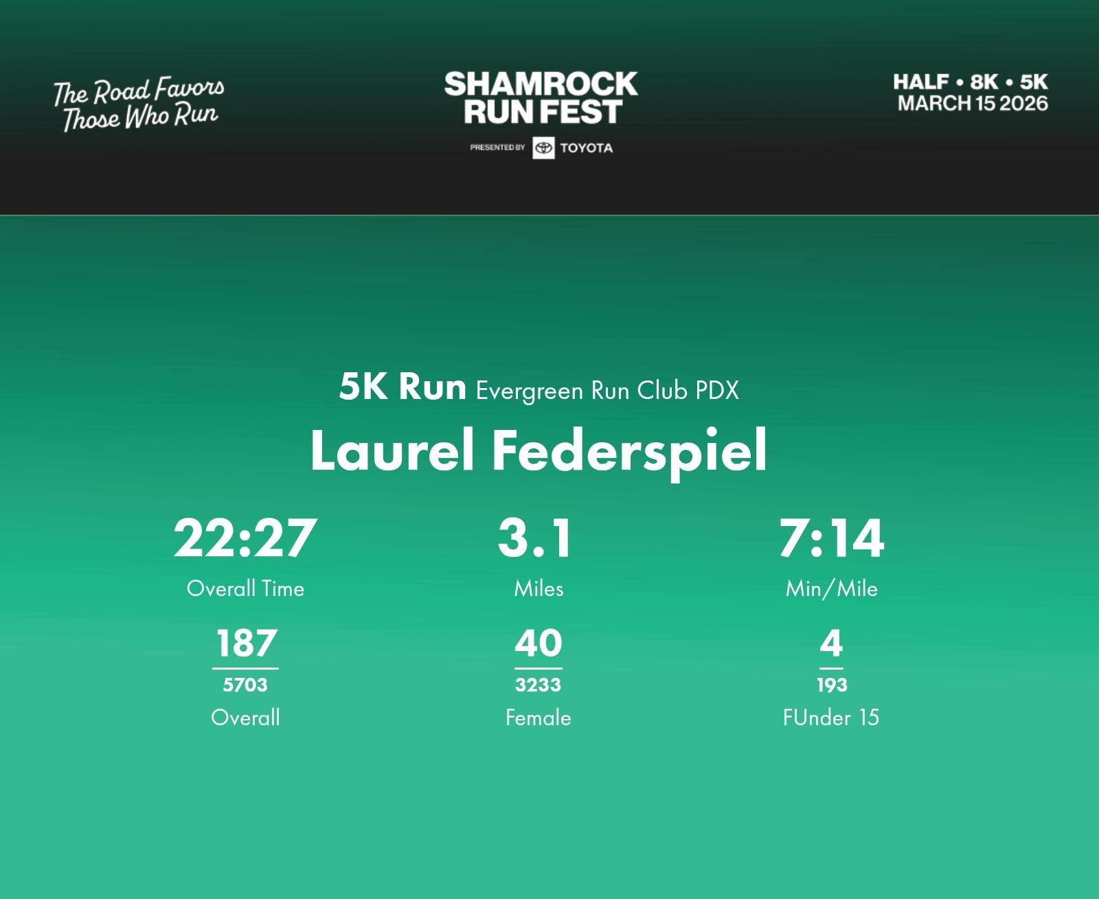 Date: March 15, 2026 Participant: Laurel Federspiel #42649 Race: 2026 Shamrock Run Fest presented by Toyota 5K Run Distance: 3.1 miles
