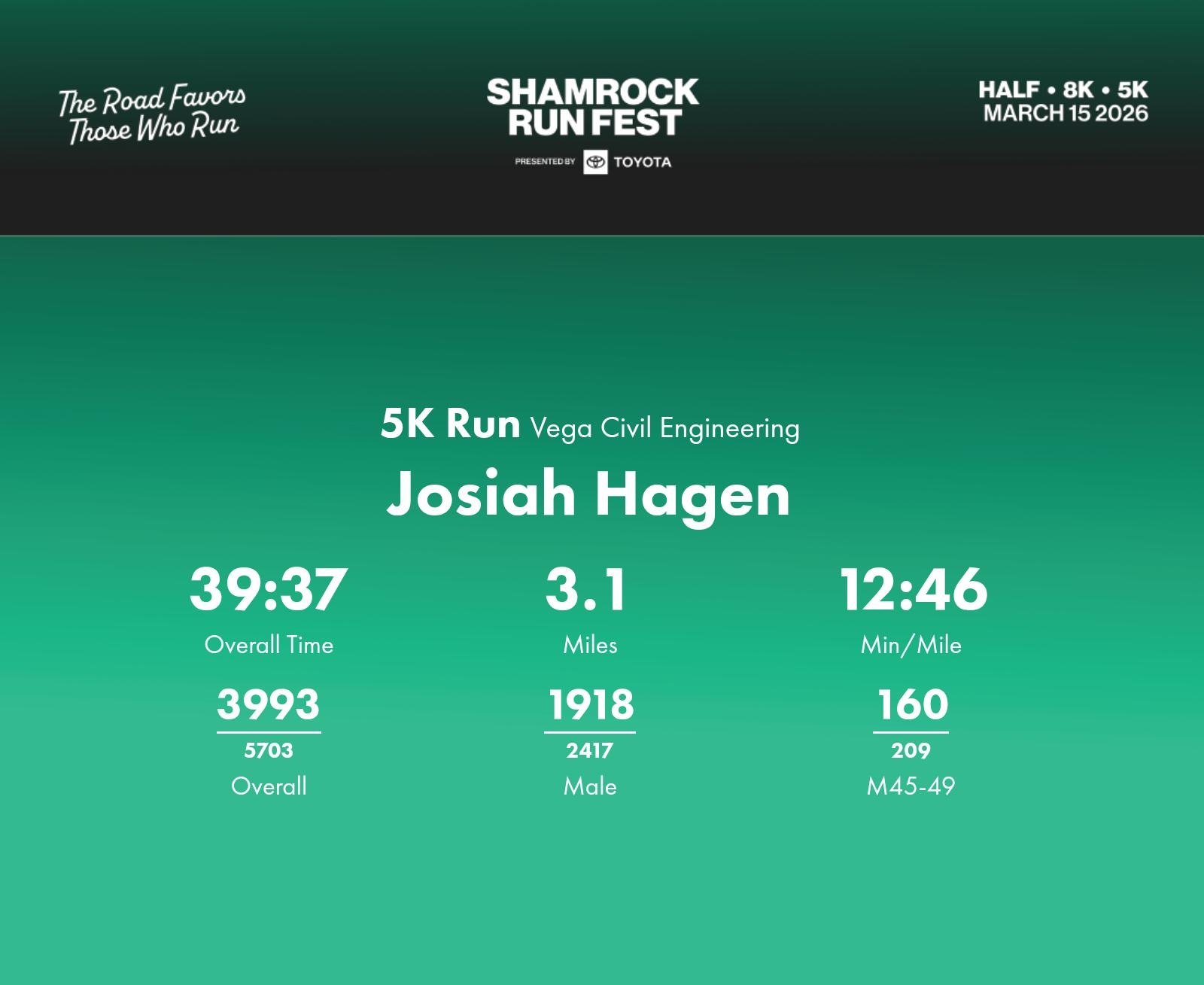 Date: March 15, 2026 Participant: Josiah Hagen #44341 Race: 2026 Shamrock Run Fest presented by Toyota 5K Run Distance: 3.1 miles