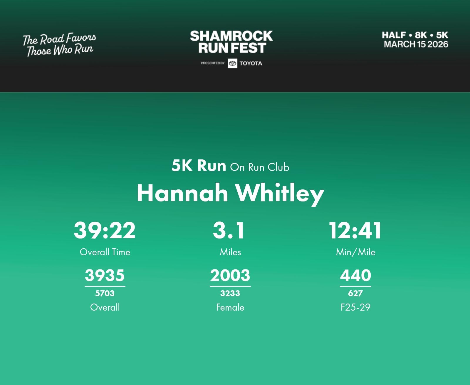 Date: March 15, 2026 Participant: Hannah Whitley #45319 Race: 2026 Shamrock Run Fest presented by Toyota 5K Run Distance: 3.1 miles