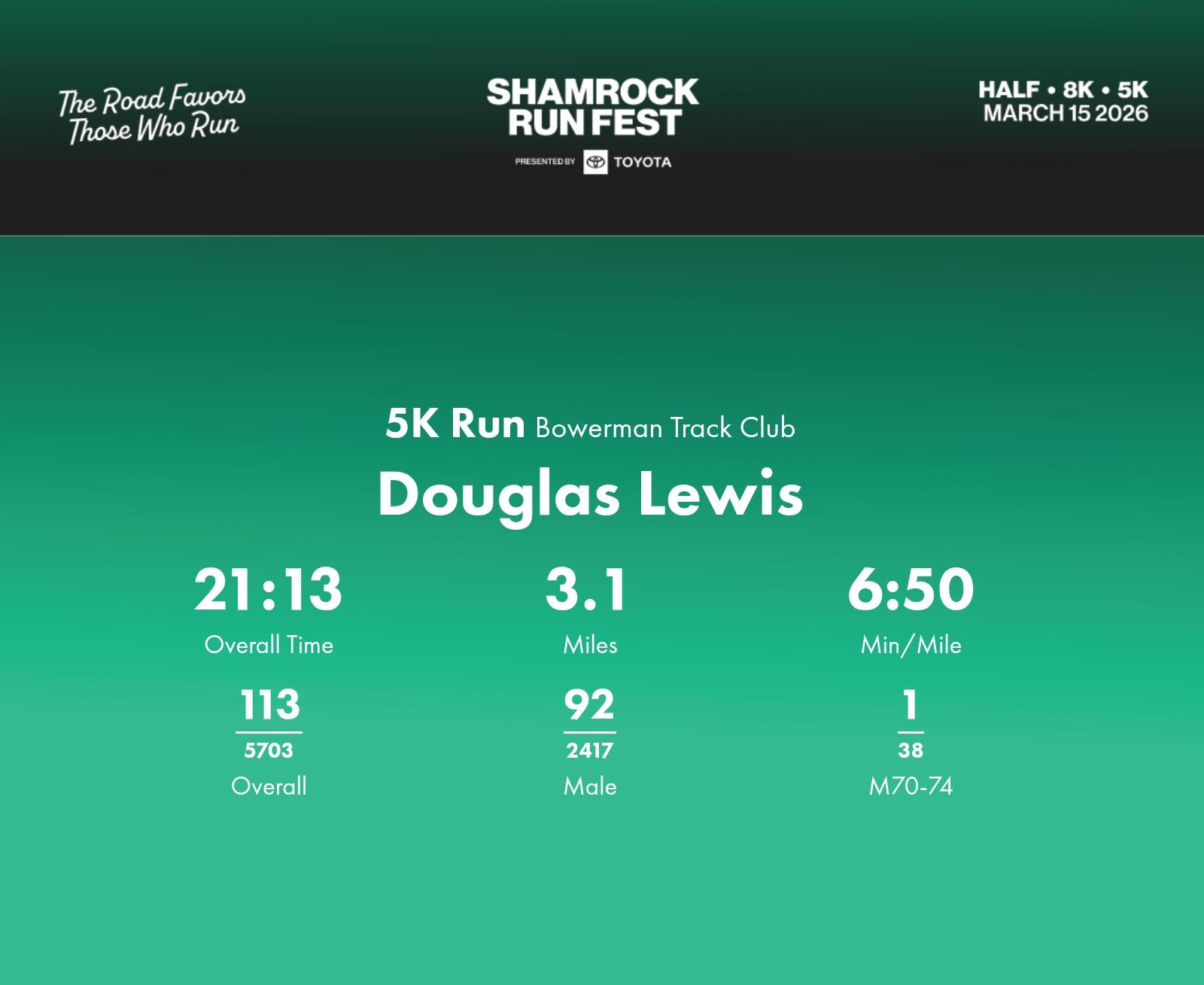 Date: March 15, 2026 Participant: Douglas Lewis #43467 Race: 2026 Shamrock Run Fest presented by Toyota 5K Run Distance: 3.1 miles