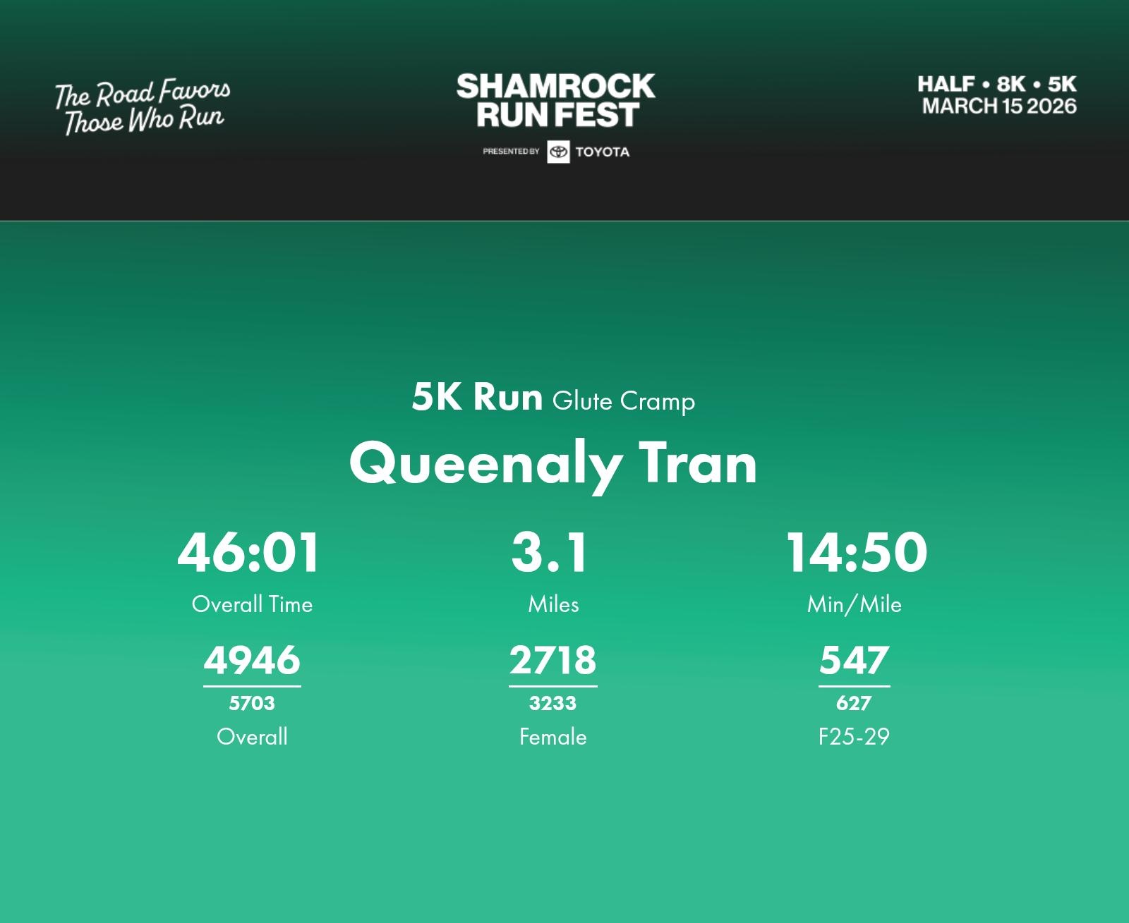 Date: March 15, 2026 Participant: Queenaly Tran #46579 Race: 2026 Shamrock Run Fest presented by Toyota 5K Run Distance: 3.1 miles