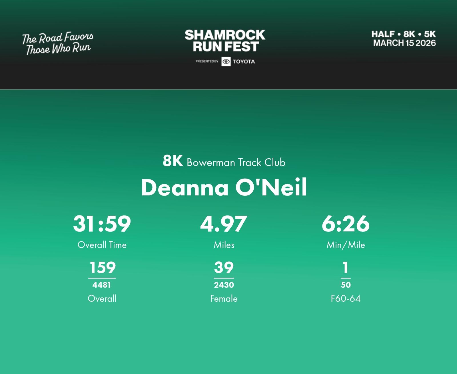 Date: March 15, 2026 Participant: Deanna O'Neil #35132 Race: 2026 Shamrock Run Fest presented by Toyota 8K Distance: 5.0 miles