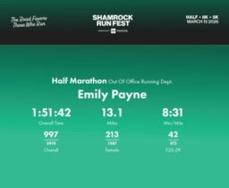 Date: March 15, 2026 Participant: Emily Payne #2482 Race: 2026 Shamrock Run Fest presented by Toyota Half Marathon Distance: 13.1 miles
