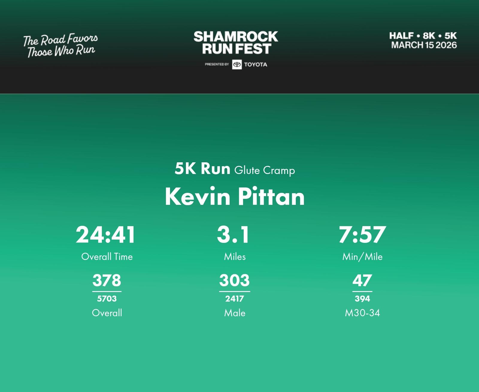 Date: March 15, 2026 Participant: Kevin Pittan #45299 Race: 2026 Shamrock Run Fest presented by Toyota 5K Run Distance: 3.1 miles