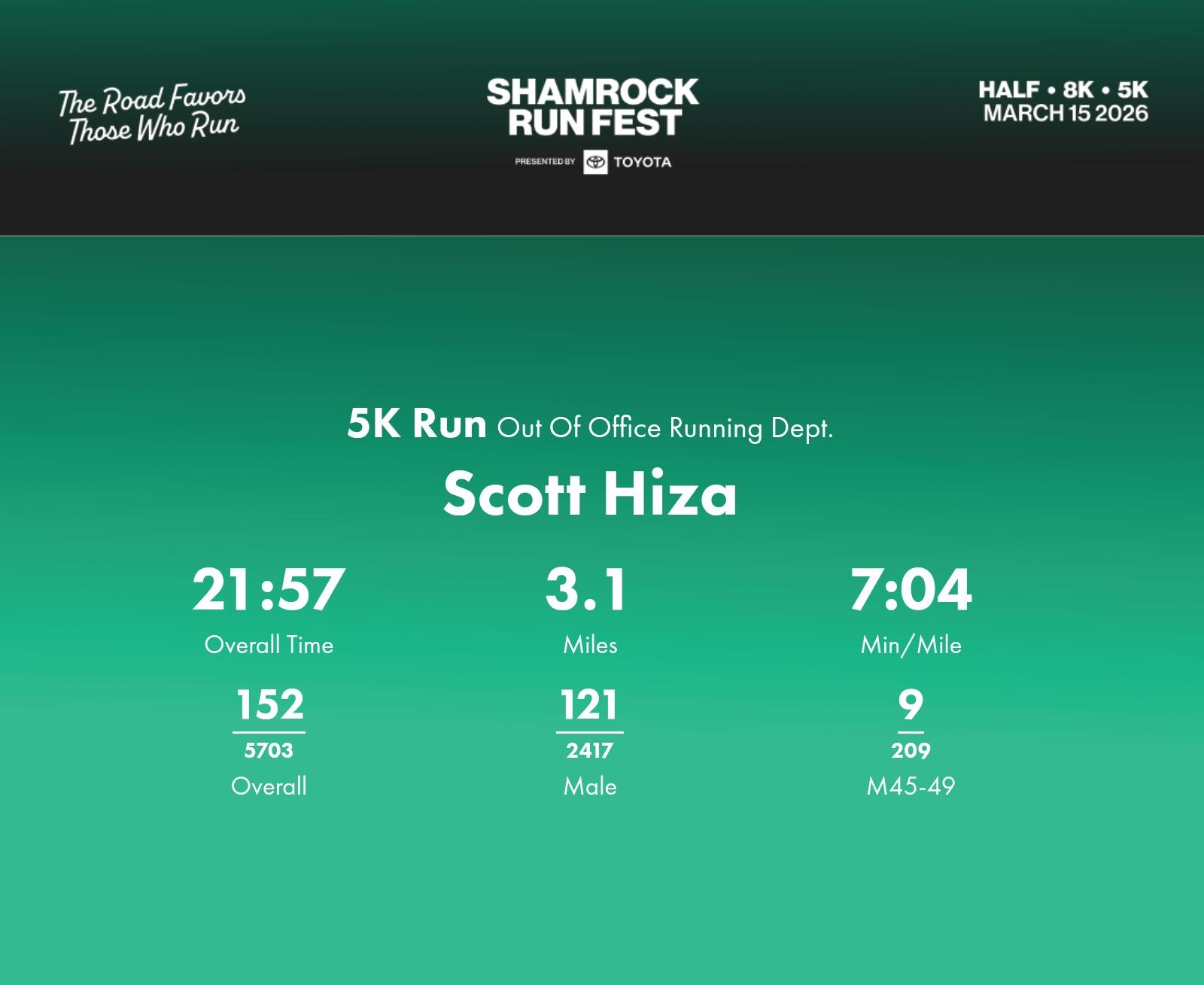 Date: March 15, 2026 Participant: Scott Hiza #45326 Race: 2026 Shamrock Run Fest presented by Toyota 5K Run Distance: 3.1 miles