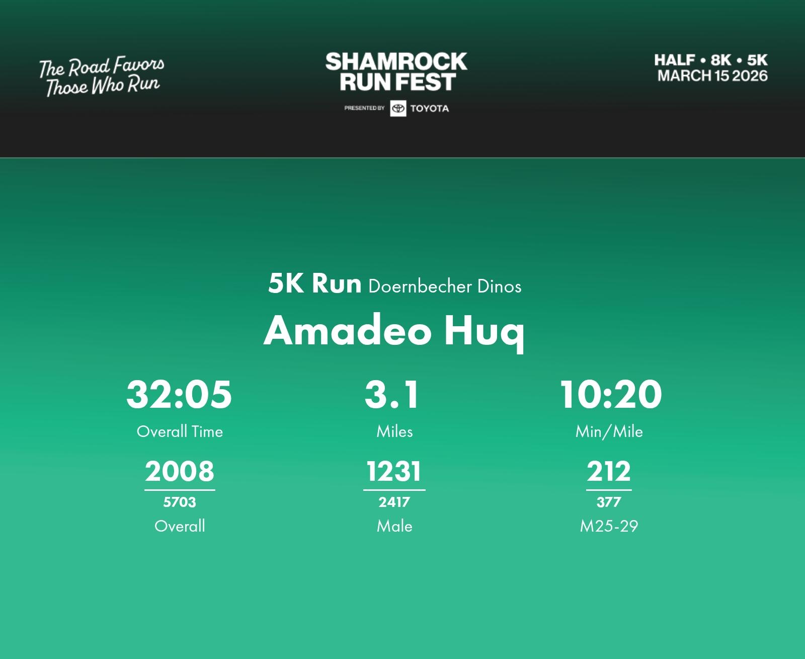 Date: March 15, 2026 Participant: Amadeo Huq #42852 Race: 2026 Shamrock Run Fest presented by Toyota 5K Run Distance: 3.1 miles