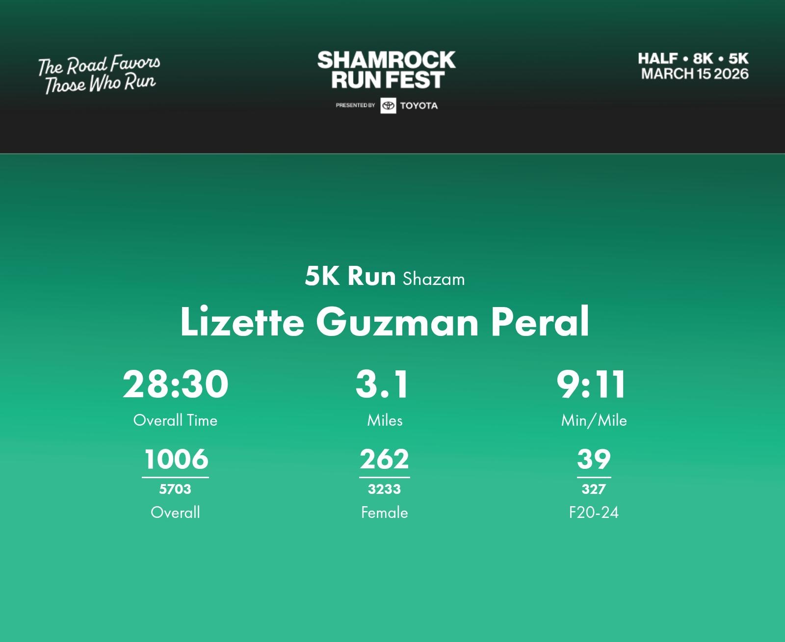 Date: March 15, 2026 Participant: Lizette Guzman Peral #45145 Race: 2026 Shamrock Run Fest presented by Toyota 5K Run Distance: 3.1 miles
