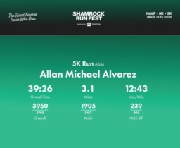 Date: March 15, 2026 Participant: Allan Michael Alvarez #41952 Race: 2026 Shamrock Run Fest presented by Toyota 5K Run Distance: 3.1 miles