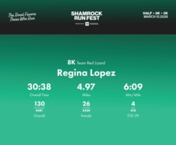 Date: March 15, 2026 Participant: Regina Lopez #31405 Race: 2026 Shamrock Run Fest presented by Toyota 8K Distance: 5.0 miles