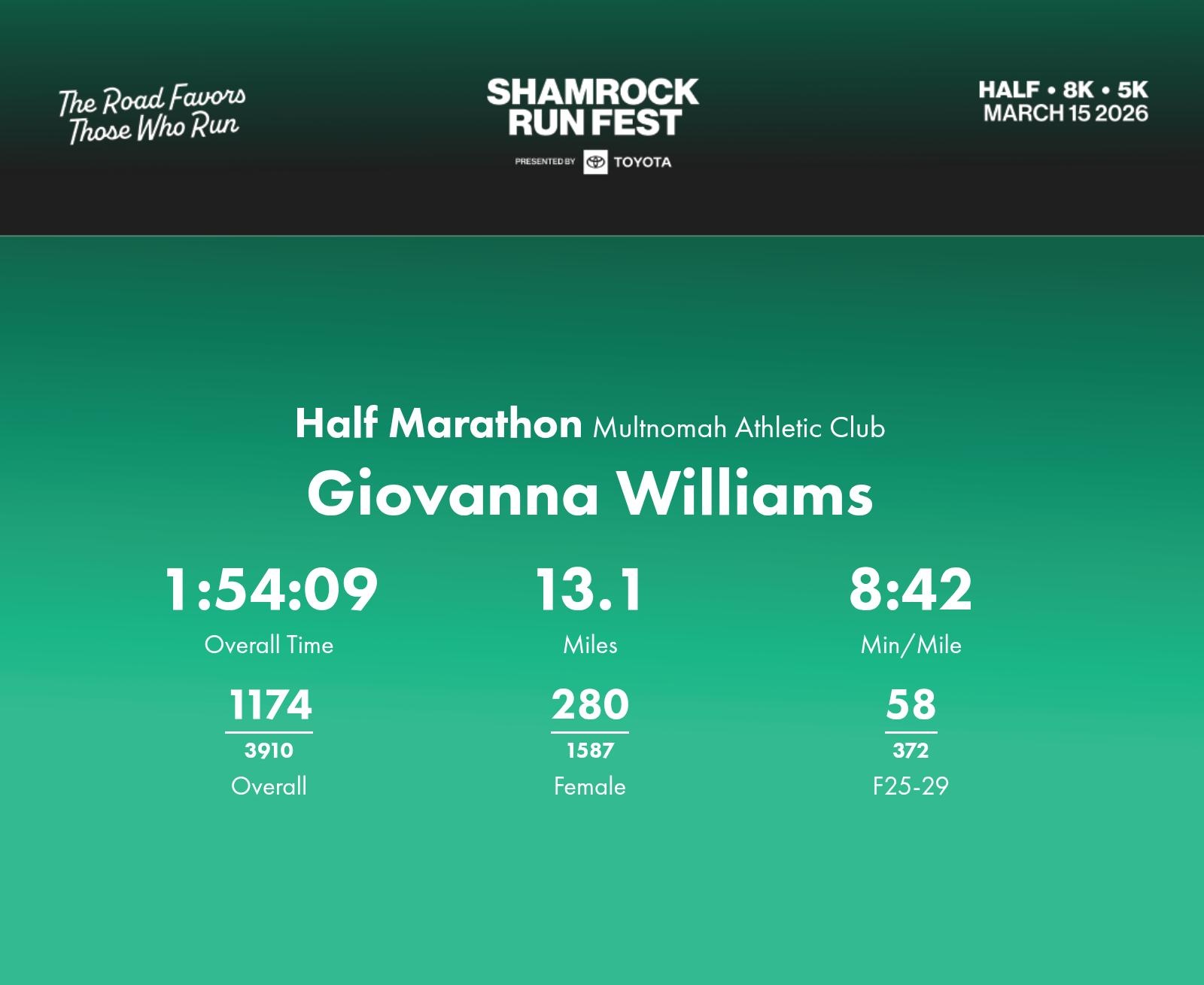 Date: March 15, 2026 Participant: Giovanna Williams #2904 Race: 2026 Shamrock Run Fest presented by Toyota Half Marathon Distance: 13.1 miles