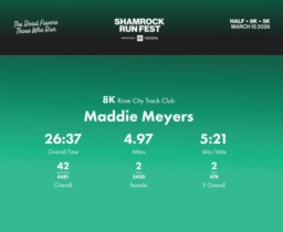 Date: March 15, 2026 Participant: Maddie Meyers #33736 Race: 2026 Shamrock Run Fest presented by Toyota 8K Distance: 5.0 miles