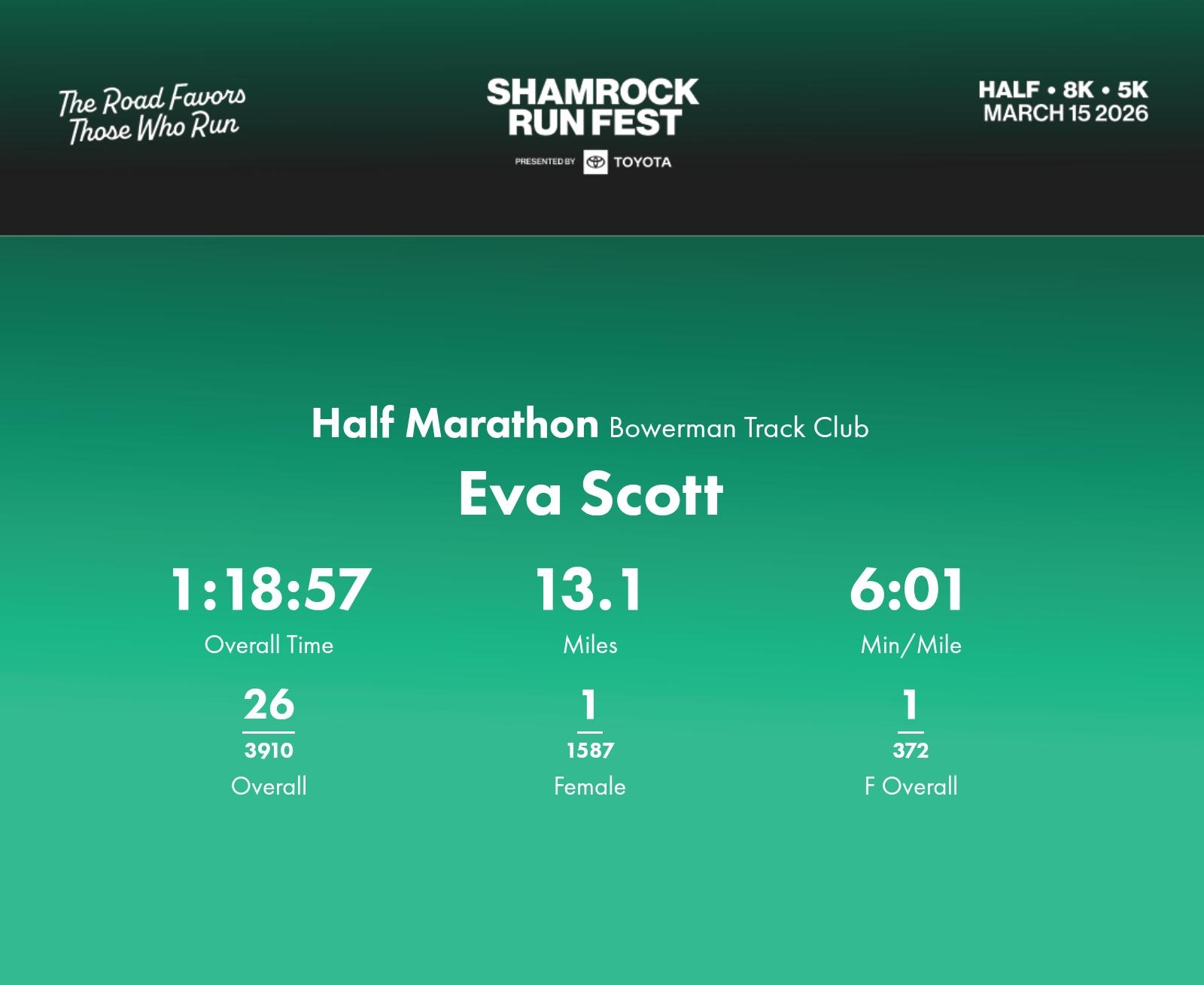 Date: March 15, 2026 Participant: Eva Scott #3876 Race: 2026 Shamrock Run Fest presented by Toyota Half Marathon Distance: 13.1 miles