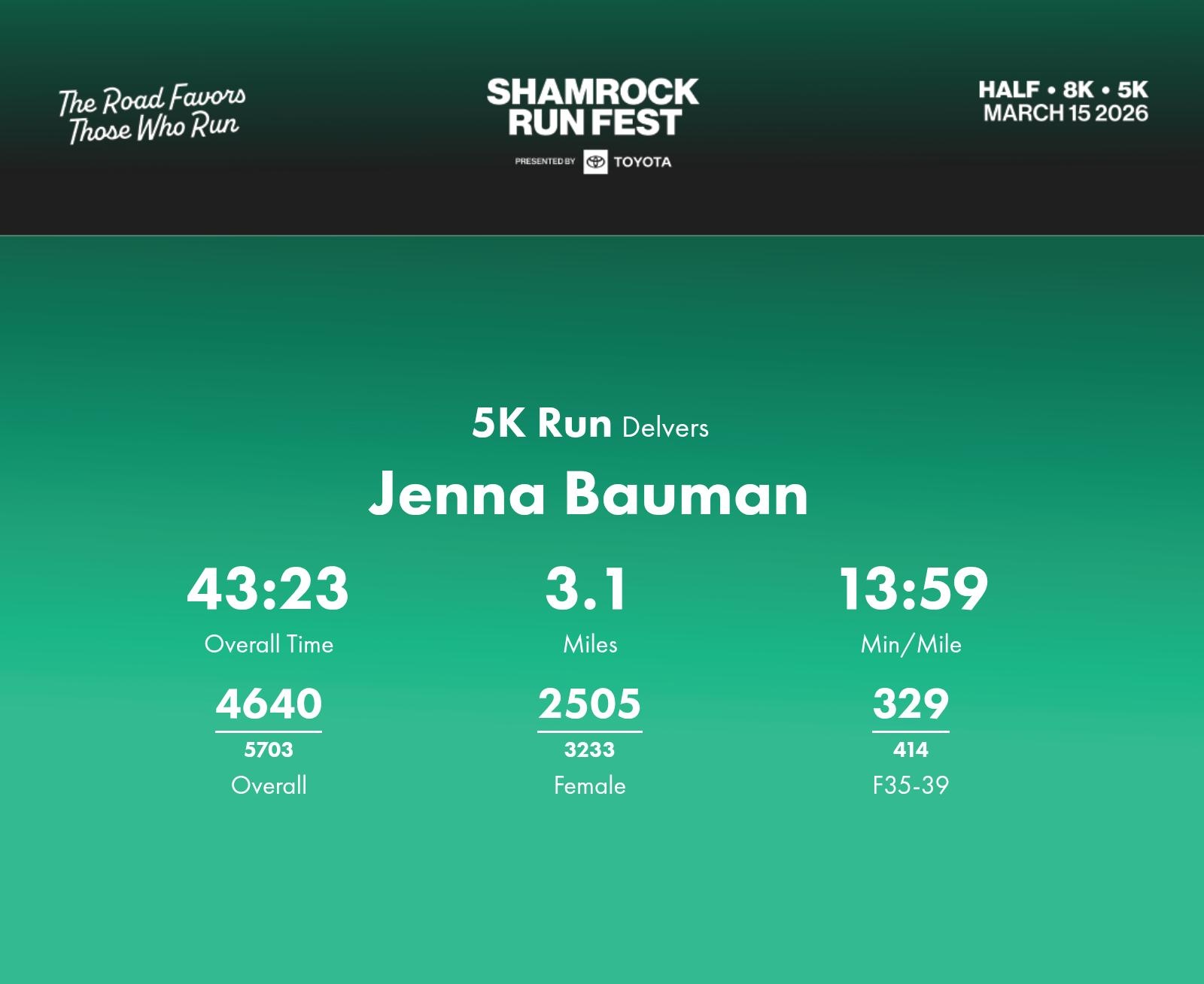 Date: March 15, 2026 Participant: Jenna Bauman #45175 Race: 2026 Shamrock Run Fest presented by Toyota 5K Run Distance: 3.1 miles