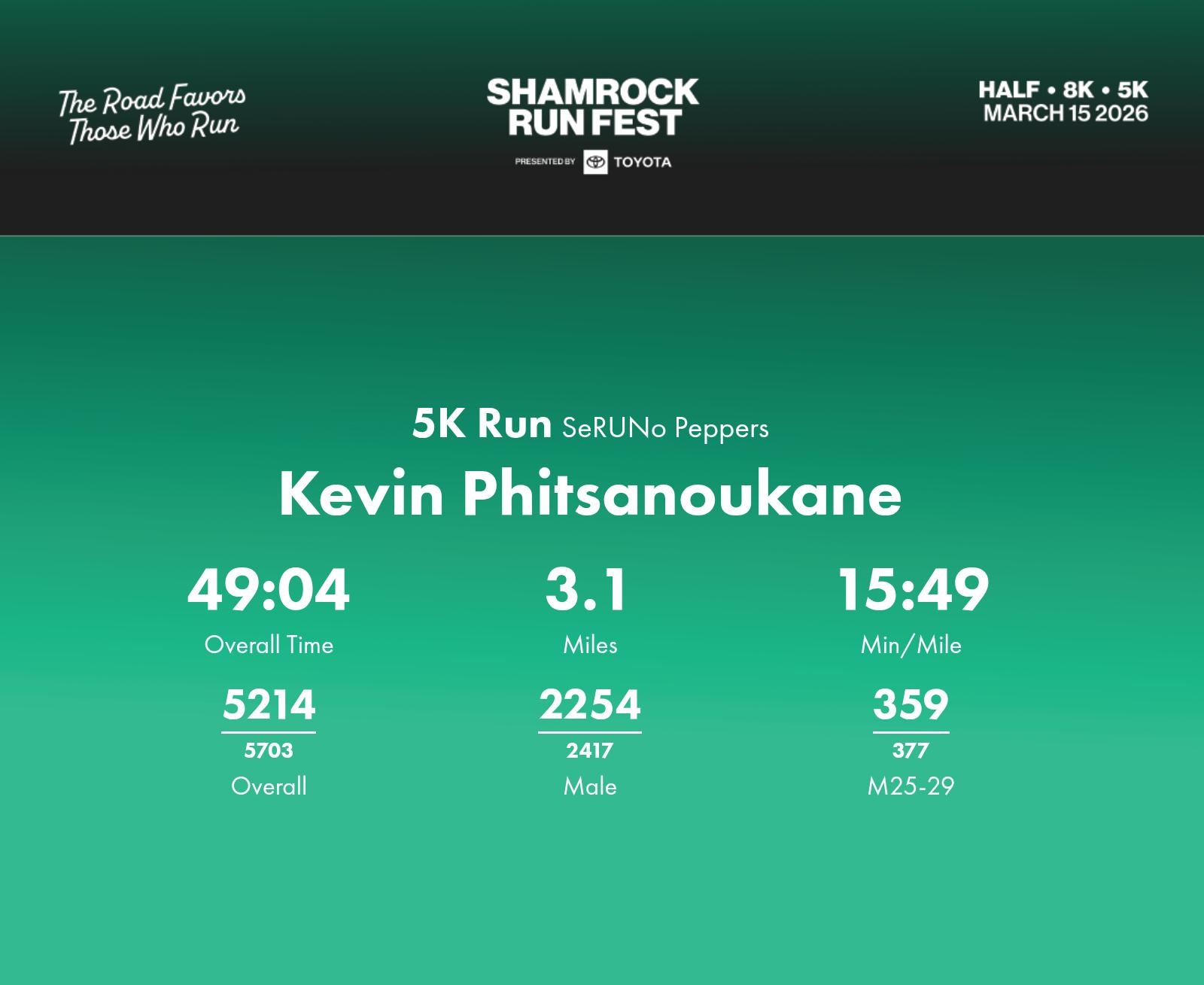 Date: March 15, 2026 Participant: Kevin Phitsanoukane #46582 Race: 2026 Shamrock Run Fest presented by Toyota 5K Run Distance: 3.1 miles