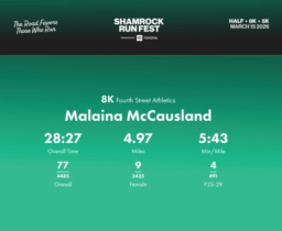 Date: March 15, 2026 Participant: Malaina McCausland #33738 Race: 2026 Shamrock Run Fest presented by Toyota 8K Distance: 5.0 miles