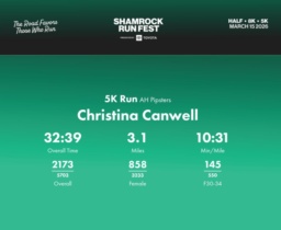Date: March 15, 2026 Participant: Christina Canwell #44749 Race: 2026 Shamrock Run Fest presented by Toyota 5K Run Distance: 3.1 miles