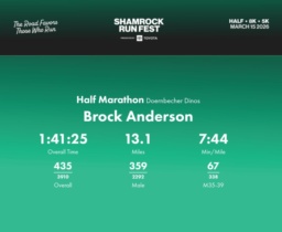 Date: March 15, 2026 Participant: Brock Anderson #3565 Race: 2026 Shamrock Run Fest presented by Toyota Half Marathon Distance: 13.1 miles