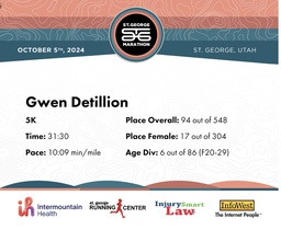 | Finish | 3.1 | 31:30 | 10:09/miles | 3.1 | 31:30 | 10:09/miles | 94 | 17 F | 6 F20-29 |