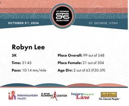 | Finish | 3.1 | 31:45 | 10:14/miles | 3.1 | 31:45 | 10:14/miles | 99 | 21 F | 2 F30-39 |