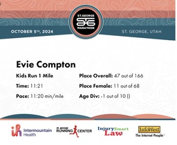 | Finish | 1.0 | 11:21 | 11:20/miles | 1.0 | 11:21 | 11:20/miles | 47 | 11 F | |