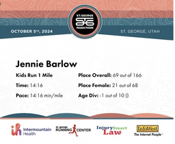| Finish | 1.0 | 14:16 | 14:16/miles | 1.0 | 14:16 | 14:16/miles | 69 | 21 F | |