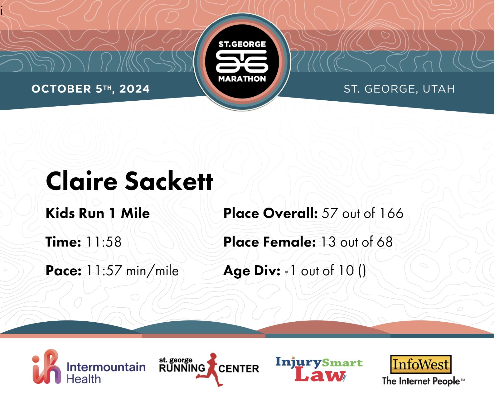 | Finish | 1.0 | 11:58 | 11:57/miles | 1.0 | 11:58 | 11:57/miles | 57 | 13 F | |