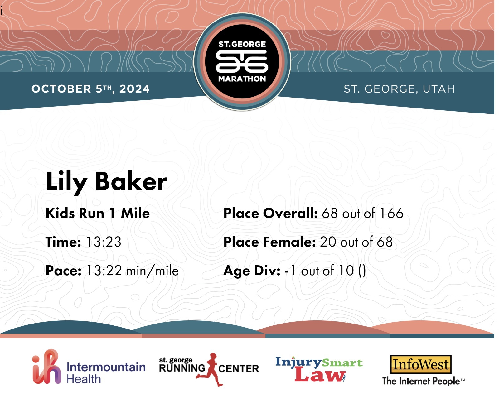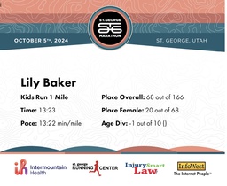 | Finish | 1.0 | 13:23 | 13:22/miles | 1.0 | 13:23 | 13:22/miles | 68 | 20 F | |