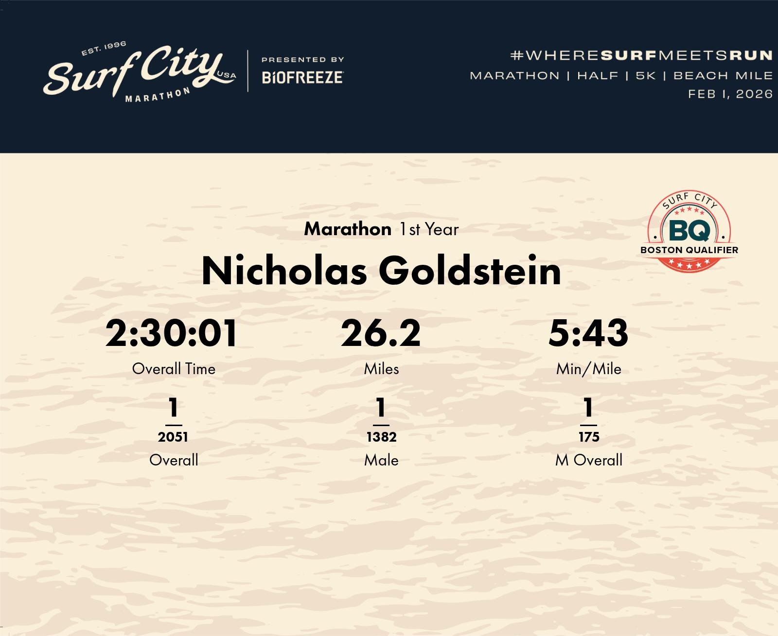Date: Feb. 1, 2026 Participant: Nicholas Goldstein #22286 Race: 2026 Surf City Marathon Distance: 26.2 miles