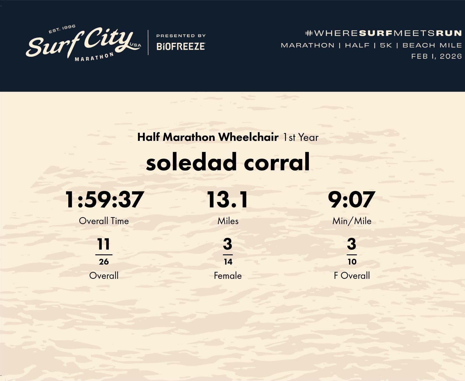 Date: Feb. 1, 2026 Participant: soledad corral #8024 Race: 2026 Surf City Half Marathon Wheelchair Distance: 13.1 miles