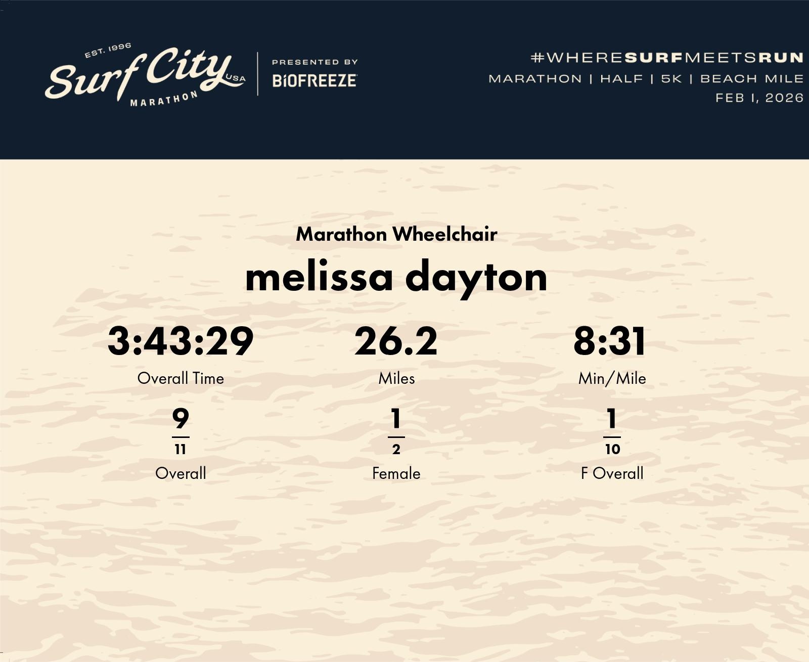 Date: Feb. 1, 2026 Participant: melissa dayton #22426 Race: 2026 Surf City Marathon Wheelchair Distance: 26.2 miles