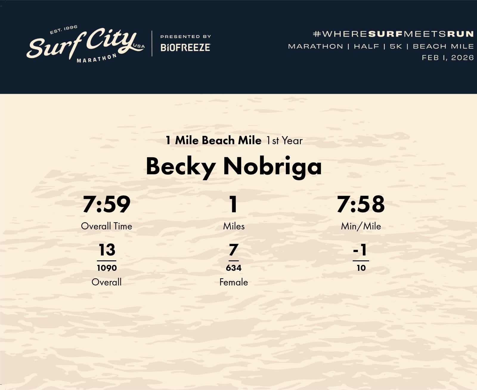Date: Jan. 30, 2026 Participant: Becky Nobriga #41037 Race: 2026 Surf City 1 Mile Beach Mile Distance: 1.0 miles