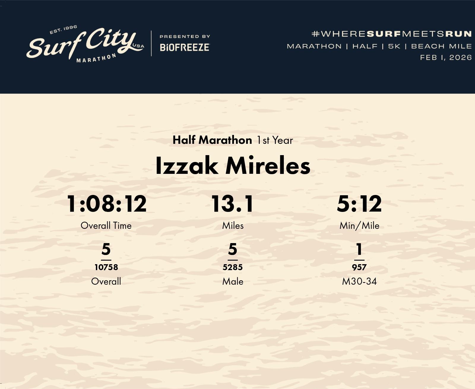 Date: Feb. 1, 2026 Participant: Izzak Mireles #13318 Race: 2026 Surf City Half Marathon Distance: 13.1 miles