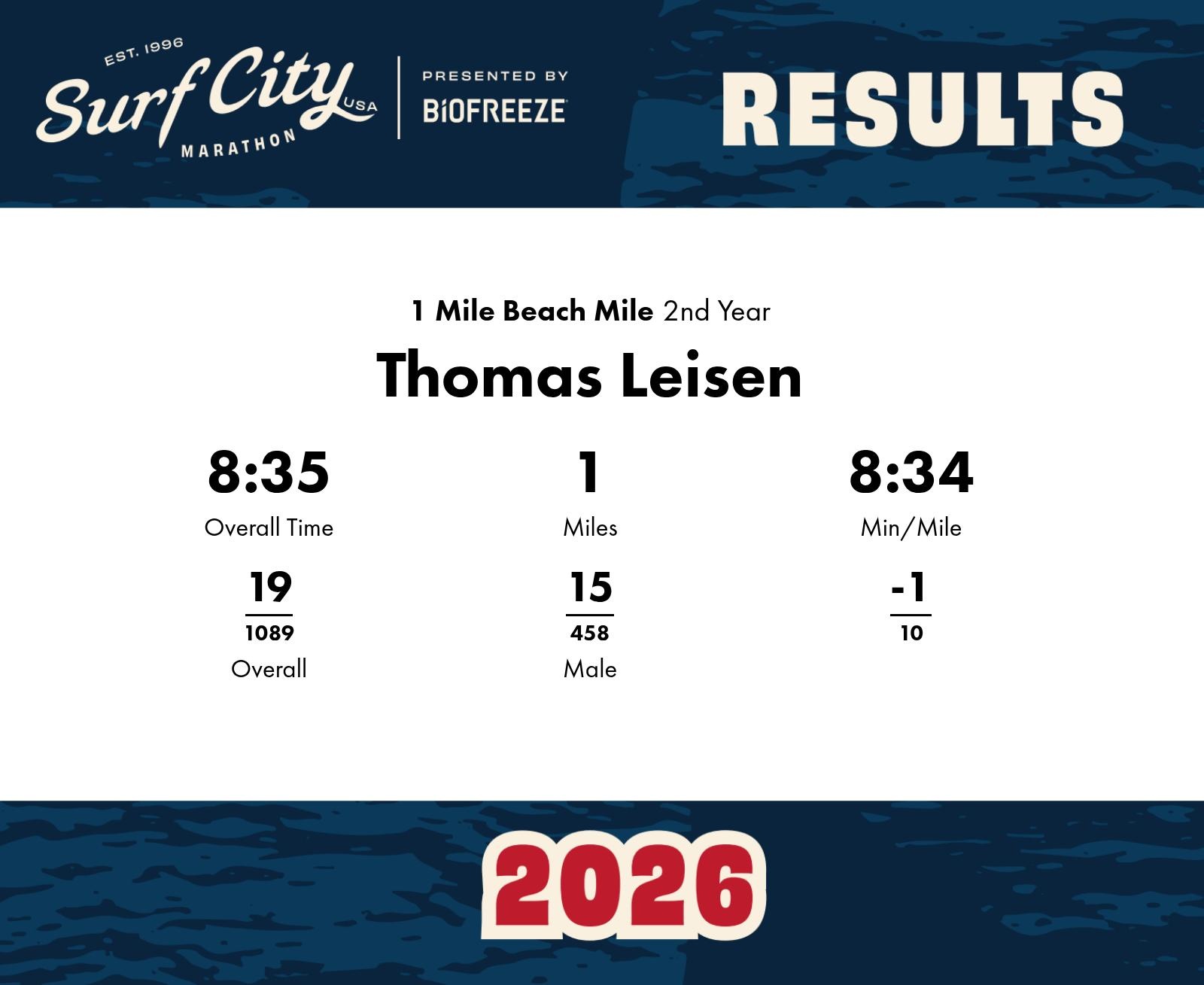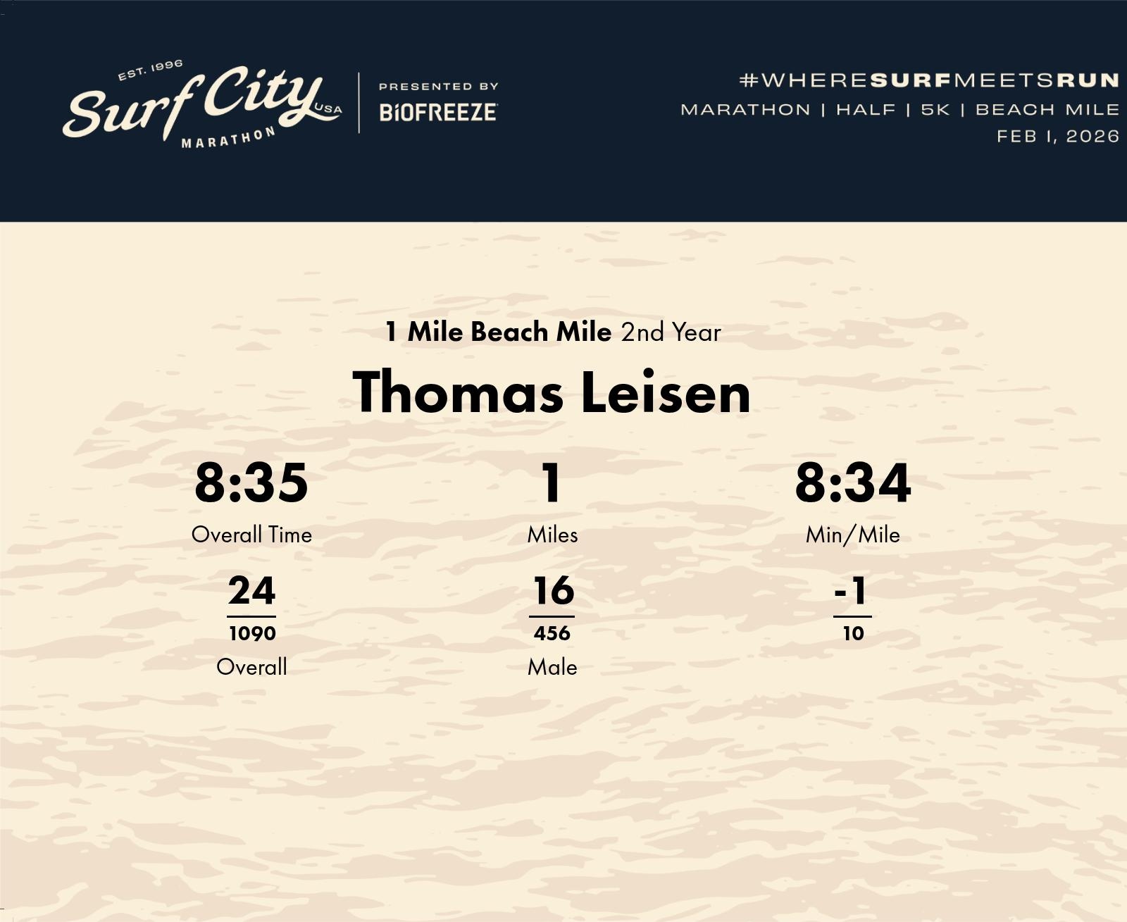 Date: Jan. 30, 2026 Participant: Thomas Leisen #41626 Race: 2026 Surf City 1 Mile Beach Mile Distance: 1.0 miles