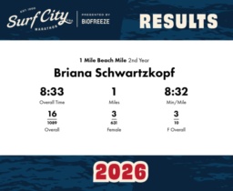Date: Jan. 30, 2026 Participant: Briana Schwartzkopf #40290 Race: 2026 Surf City 1 Mile Beach Mile Distance: 1.0 miles